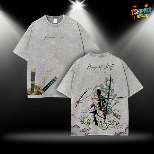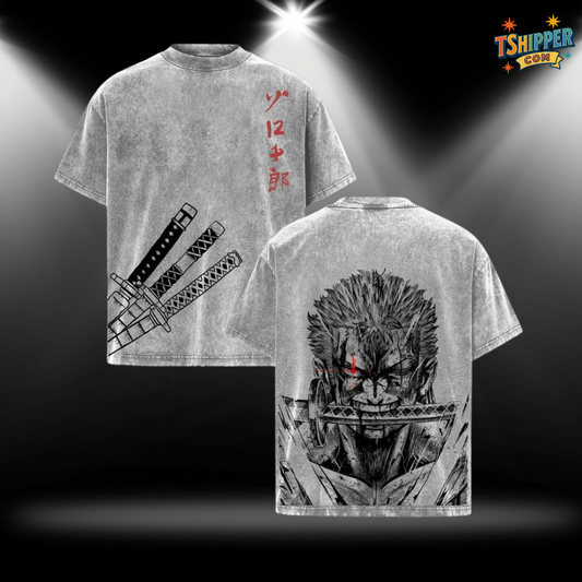 Zoro “Three Sword Style” One Piece Vintage Washed Oversized T-Shirt – Double Printed Anime Graphic Tee